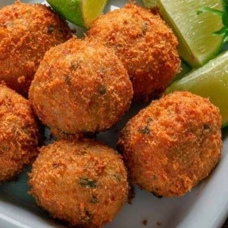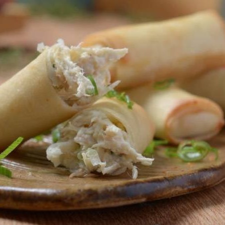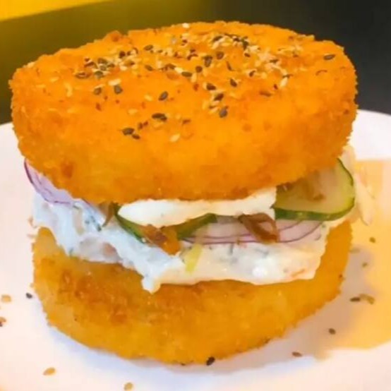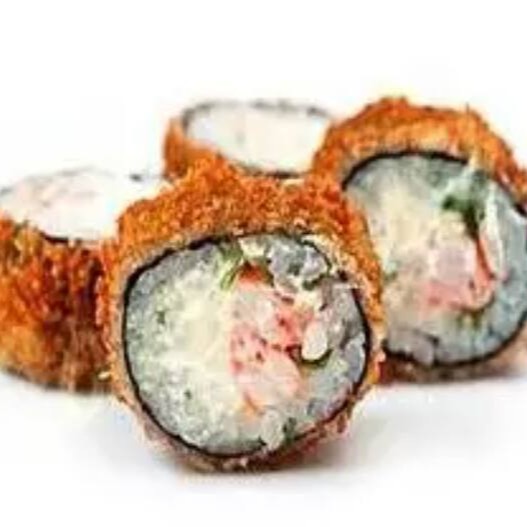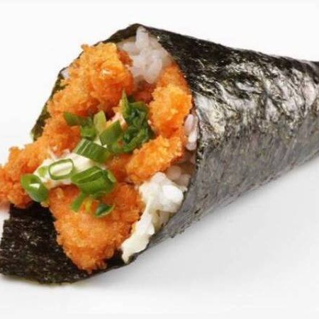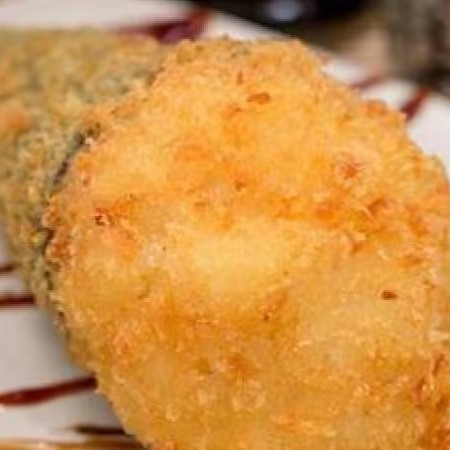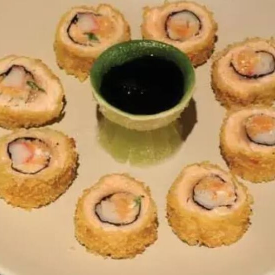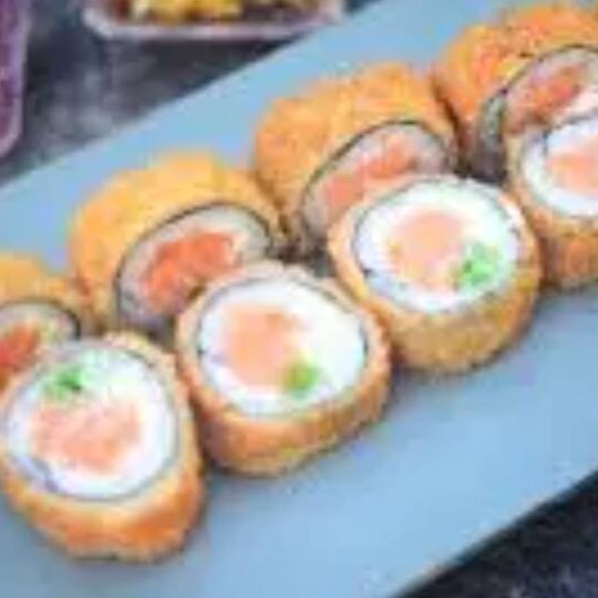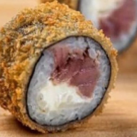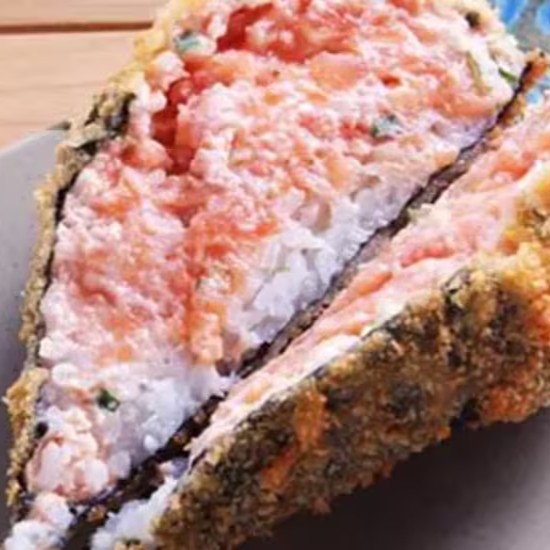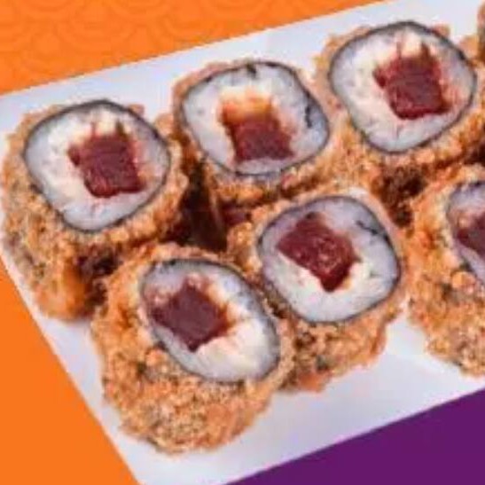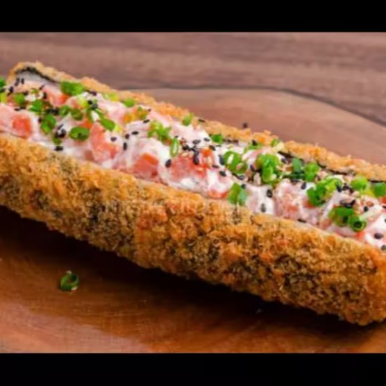 Enrolado de nori com arroz, atum, cream cheese, cebolinha, empanado e frito.