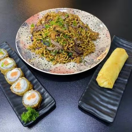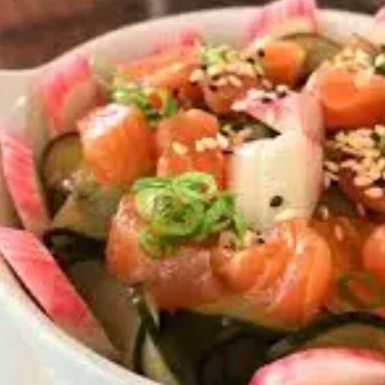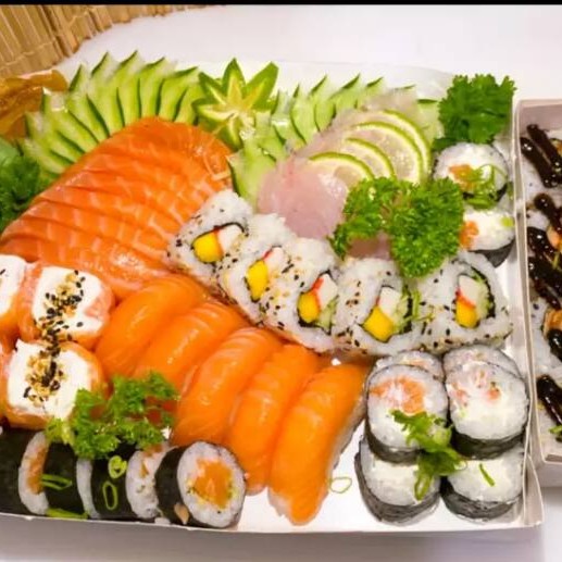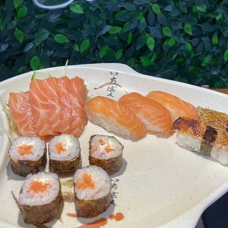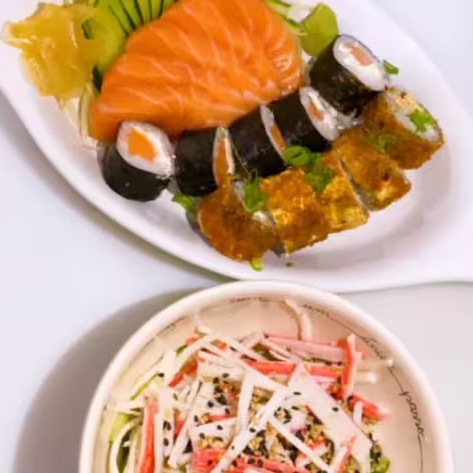 1 sunomono simples 5 sashimis de salmão 5 philadelfia 5 hot philadelfia