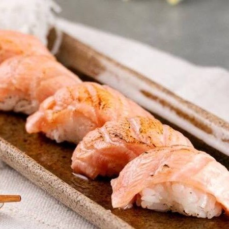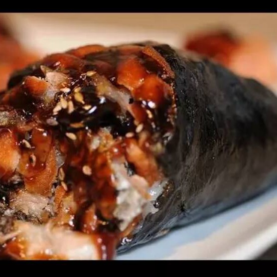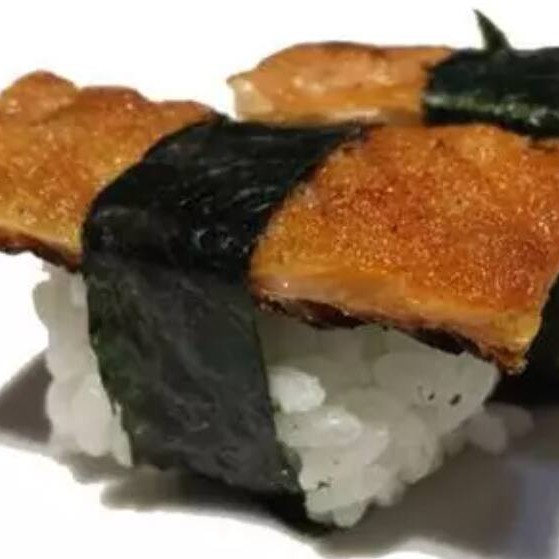 Enrolado de nori , arroz , gergelim , pele de salmão grelhada e teriaki.