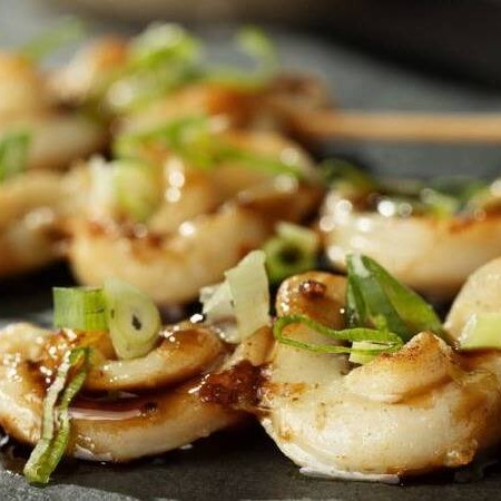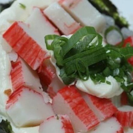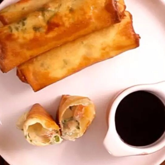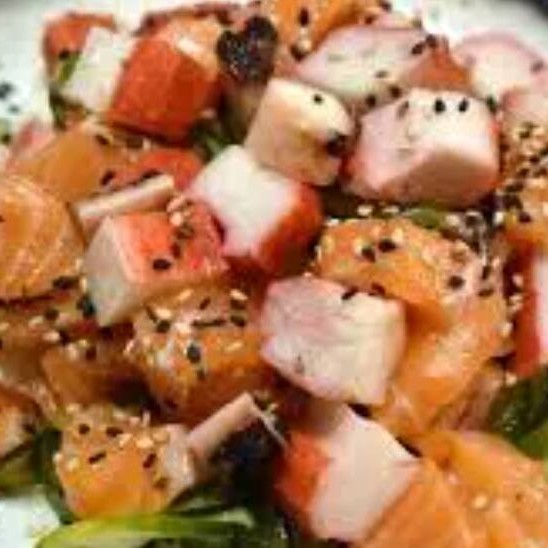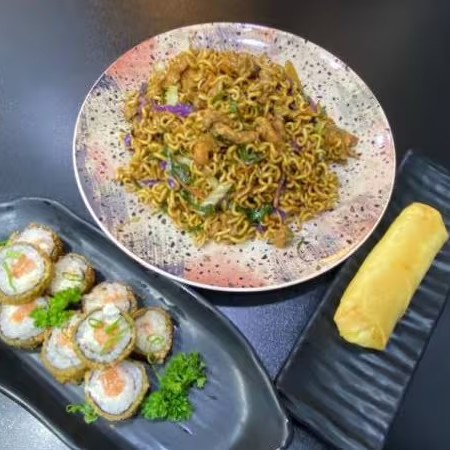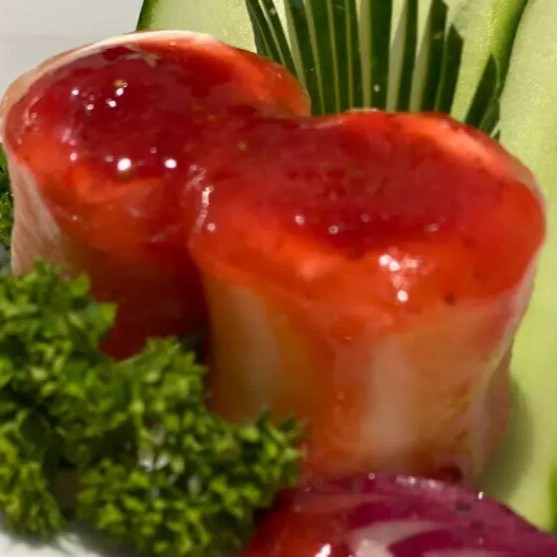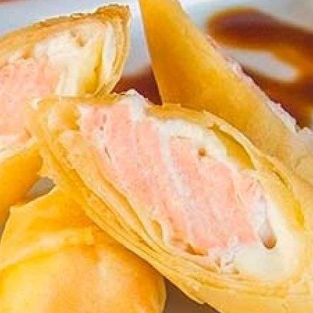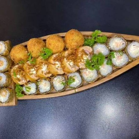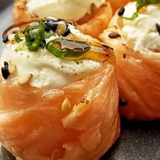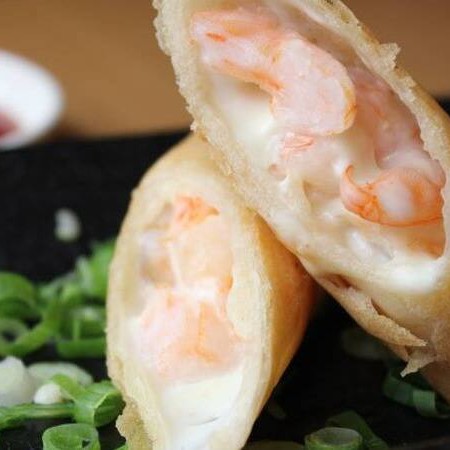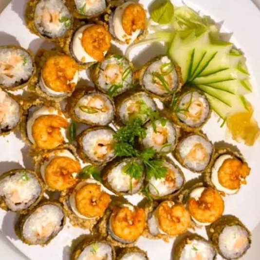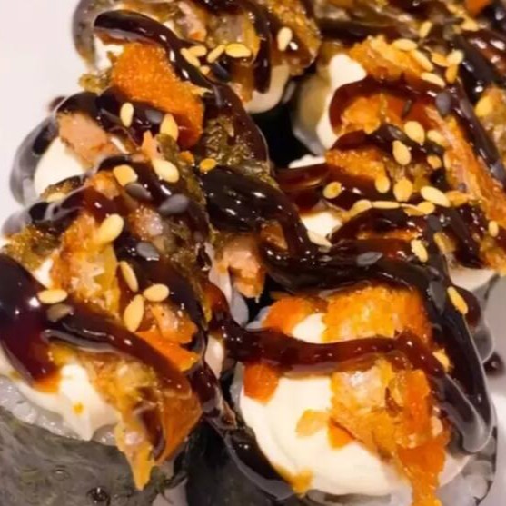 Enrolado de alga ,arroz, cream cheese , salmão e cebolinha empanado e frito coberto com camarão.