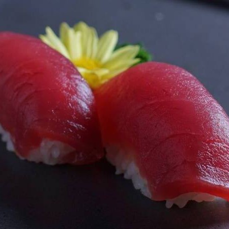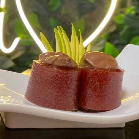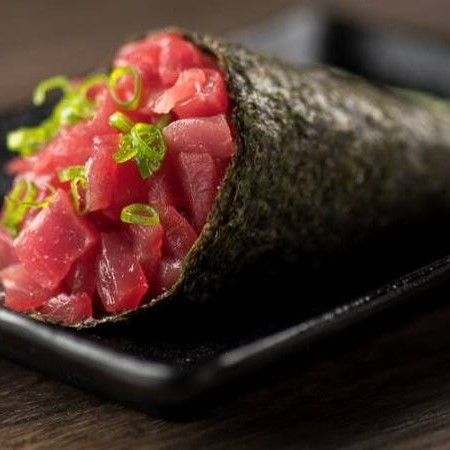 Enrolado de alga, arroz, atum, cebolinha e gergelim..