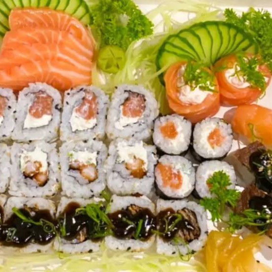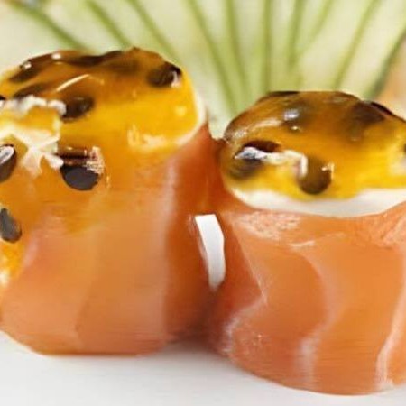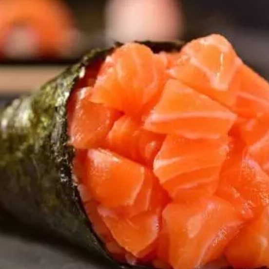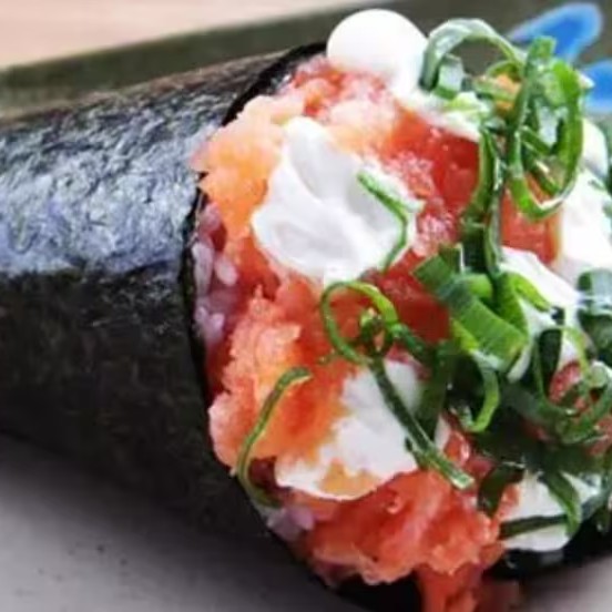 Enrolado de nori , arroz , salmão , cream cheese e cebolinha.