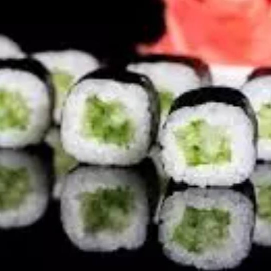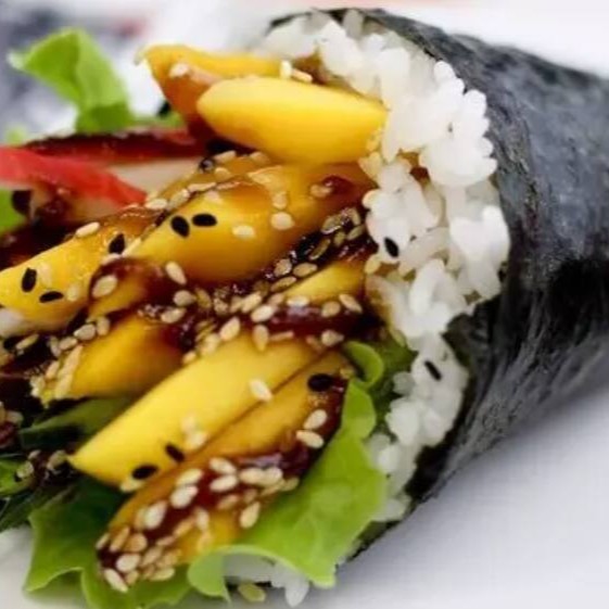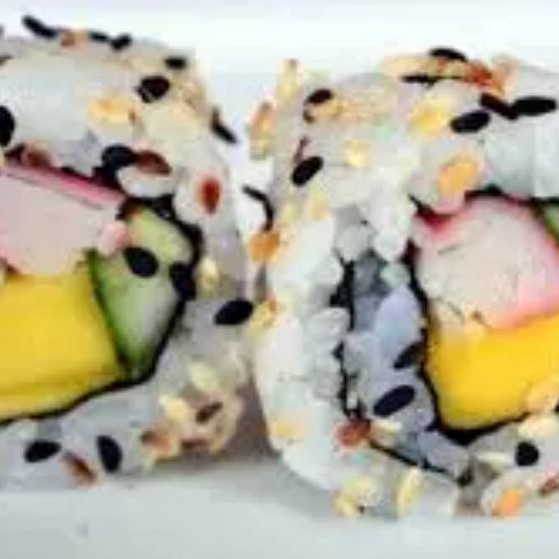 Enrolado de nori , arroz , gergelim , kani , pepino e manga.