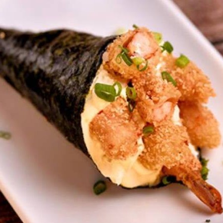 Ebi crock nori , arroz , cream cheese , camarão empanado e cebolinha.