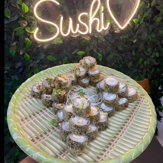 Enrolado de nori , arroz , gergelim , camarão empanado , cream cheese e cebolinha.