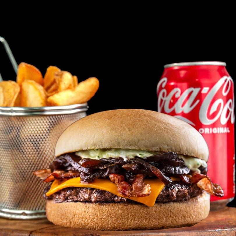120g de carne angus no maravilhoso pão brioche prime tostado com queijo cheddar, cubinhos de cebola cortadas na ponta da faca, deliciosos pickles selecionados, molhos ketchup e mostarda + batata canoa acompanhada de maionese de ervas.