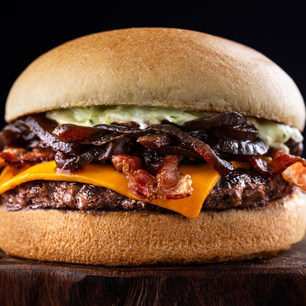 120g de carne angus no maravilhoso pão brioche prime tostado com queijo cheddar, farofa de bacon, cebola no shoyu e molho. Obs.: O molho que irá selecionar vai dentro do burger.