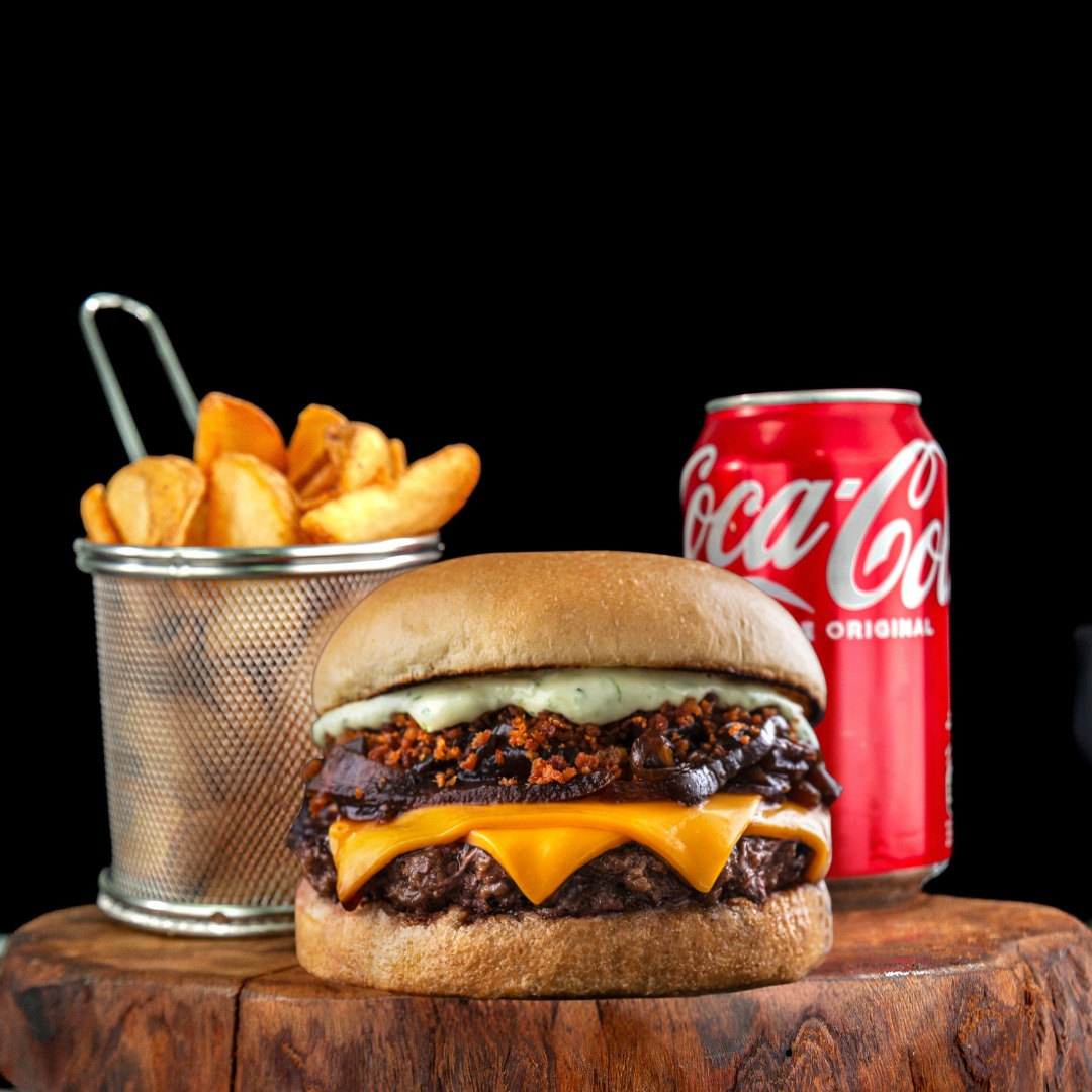 Dois deliciosos blends angus de 120g com fatias de queijo muçarela, cebola roxa, rodela de tomate, farofa de bacon, leve toque de molho Sriracha (picante) no maravilhoso pão brioche prime e molho a sua escolha + batata canoa acompanhada de maionese de ervas. Obs.: O molho que irá selecionar vai dentro do burger.