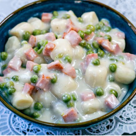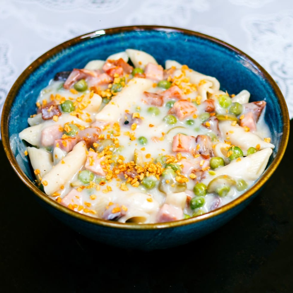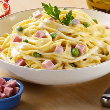 400gr dessa deliciosa massa talharim ao molho parisiense feito com nosso delicioso molho branco cremoso cubos de presunto salteado na manteiga e ervilhas frescas com uma finalização de queijo parmesão ralado na hora.