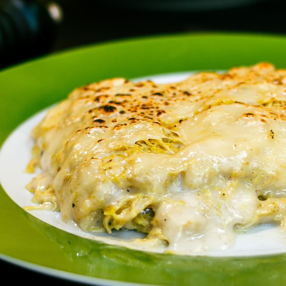 Deliciosa lasanha de frango feito com massa fresca artesanal, queijo, frango desfiado e molho branco