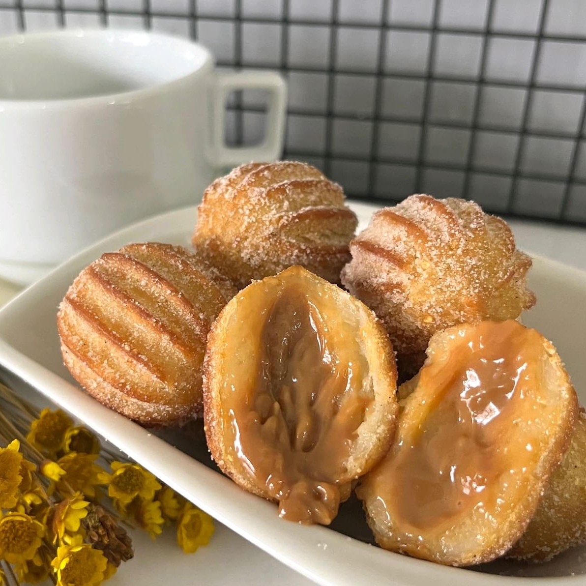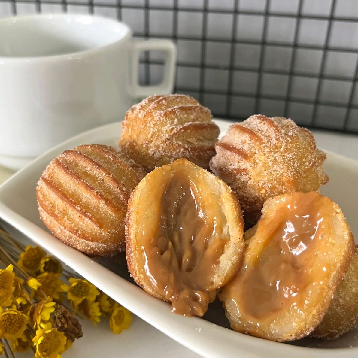 Delicioso churros frito recheado com doce de leite gourmet, coberto com açúcar e canela.