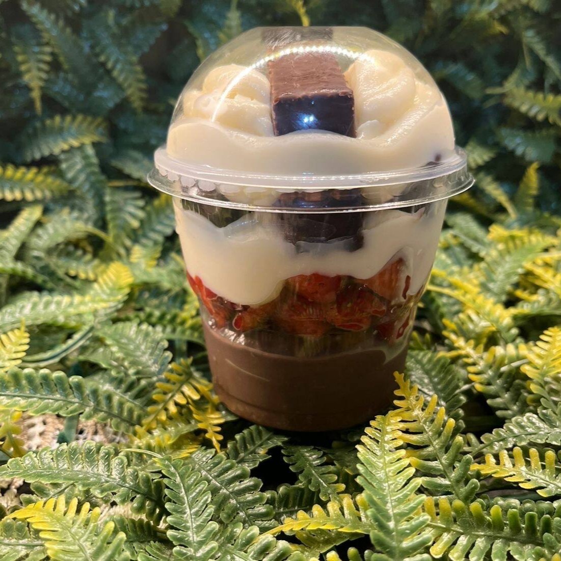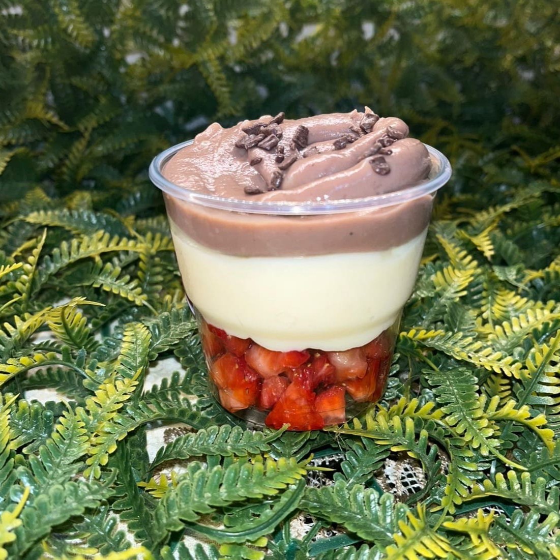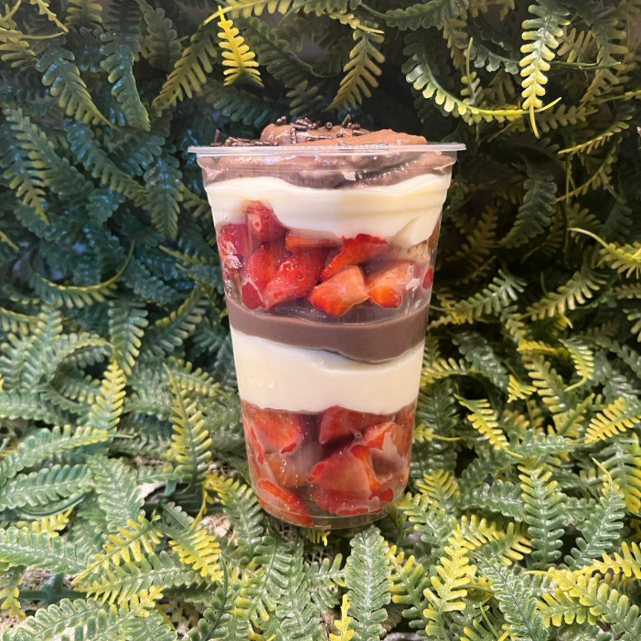 Morango ou uva, creme de chocolate, chantilly e uma camada de creme de ninho