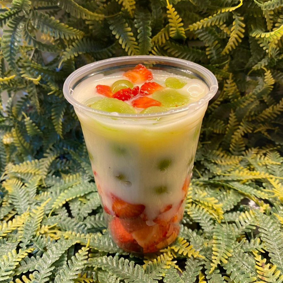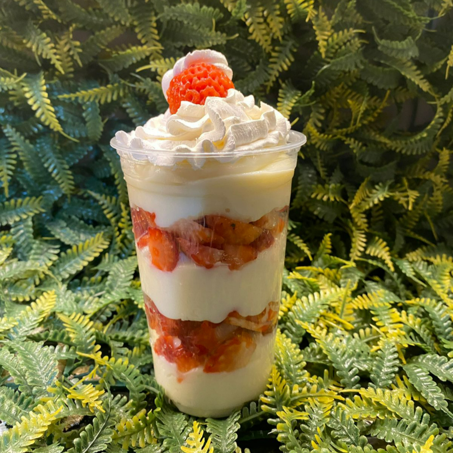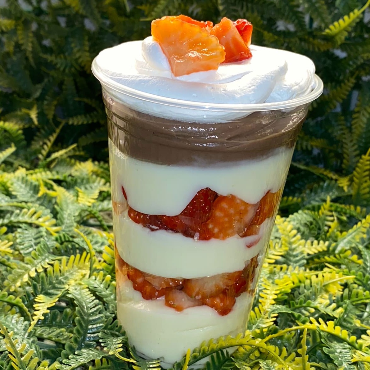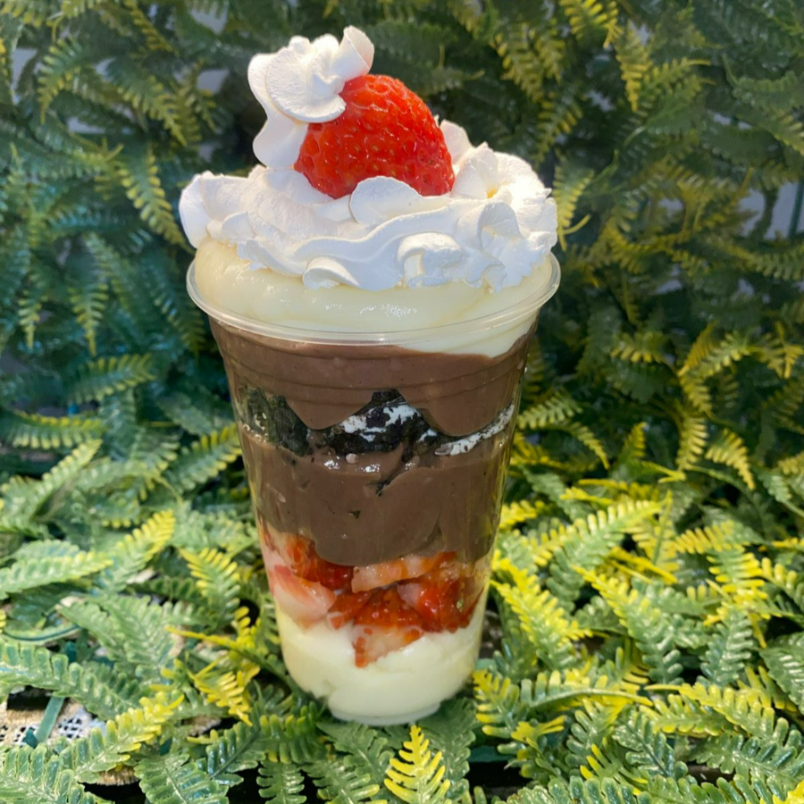 Morango ou uva, creme de chocolate, chantilly e uma camada de creme de ninho
