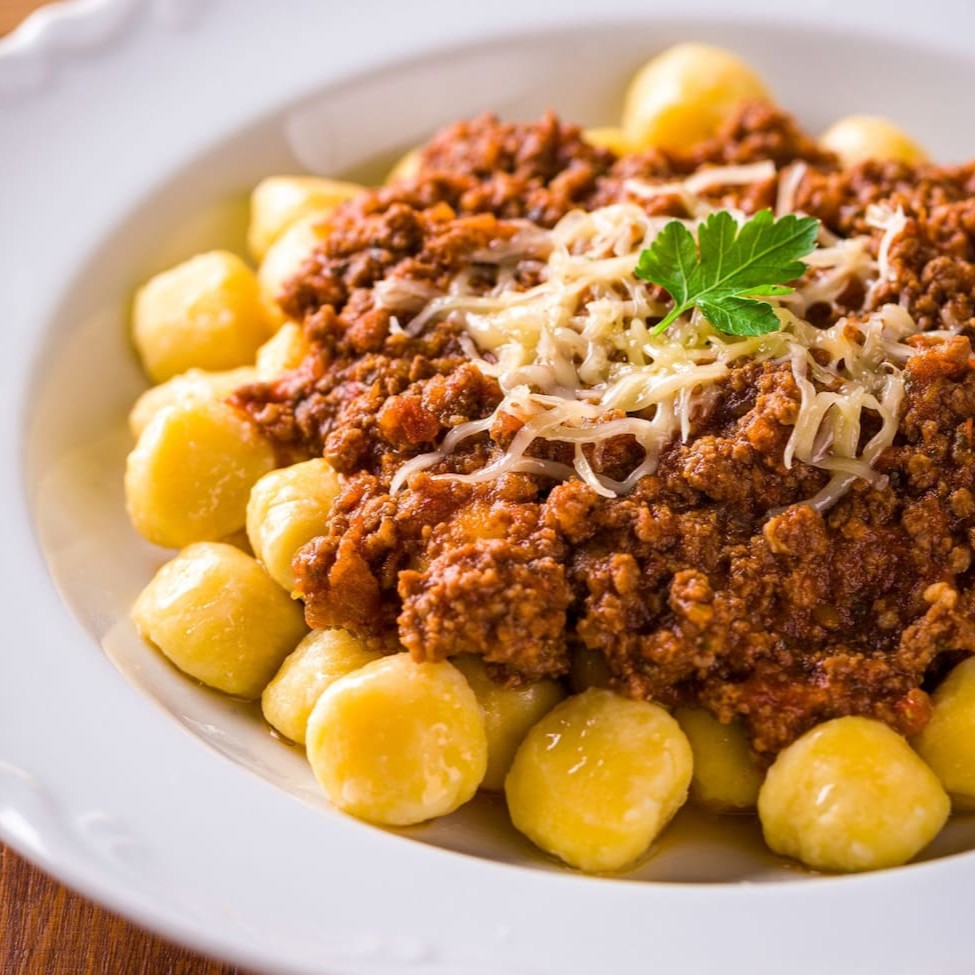 Delicioso nhoque artesanal ao molho de tomate com carne moída. Um clássico.