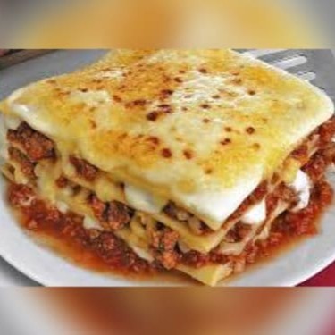 Uma deliciosa lasanha de massas artesanais com molho vermelho e carne moída.