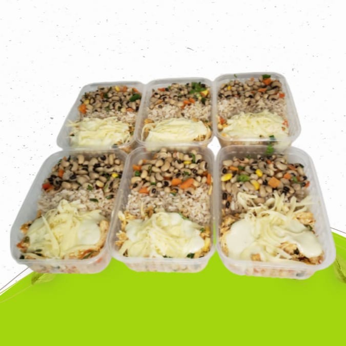 Frango Desfiado Gratinado Com Arroz Integral E Salada De Feijão Fradinho