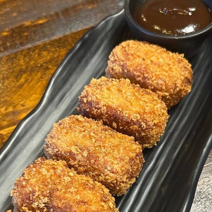 Croquete sem massa, feito com copa lombo defumado na casa, Catupiry, mozarela e empanado na farinha panko. Acompanha molho barbecue com bourbon e mel. (5 unidades)