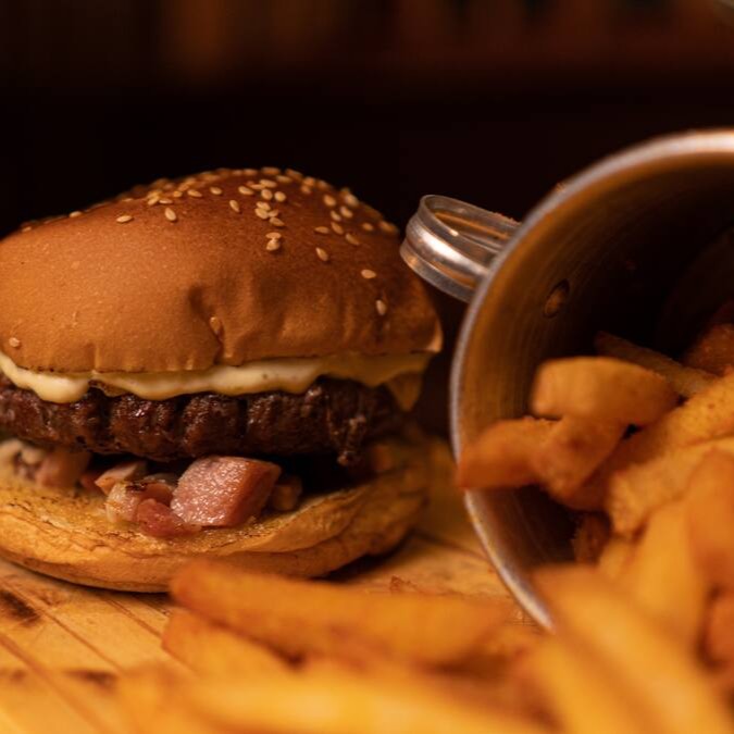 Pão brioche, blend angus de 180g, queijo prato, bacon e maionese de picles.