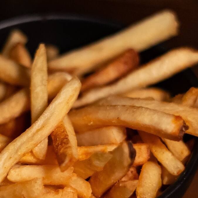 Batata frita com mistura de condimentos e temperos secos. A quantidade é indicada para 2 pessoas já levando em consideração outros dois acompanhamentos.