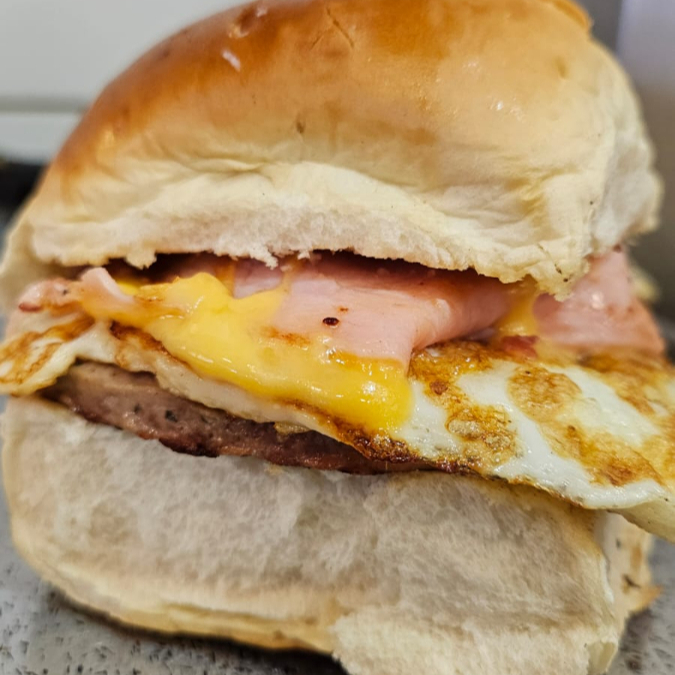 pão de hamburguer, hamburguer misto 56g, queijo, presunto e ovo