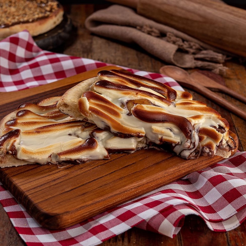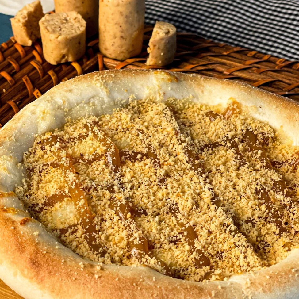 Queijo mussarela por baixo, doce de leite e muita paçoca por cima.