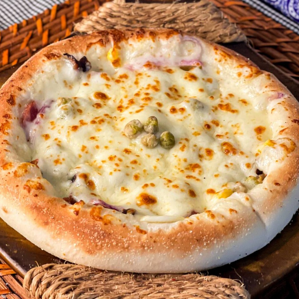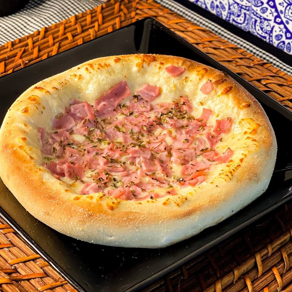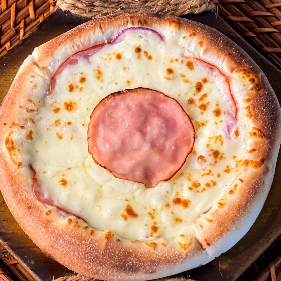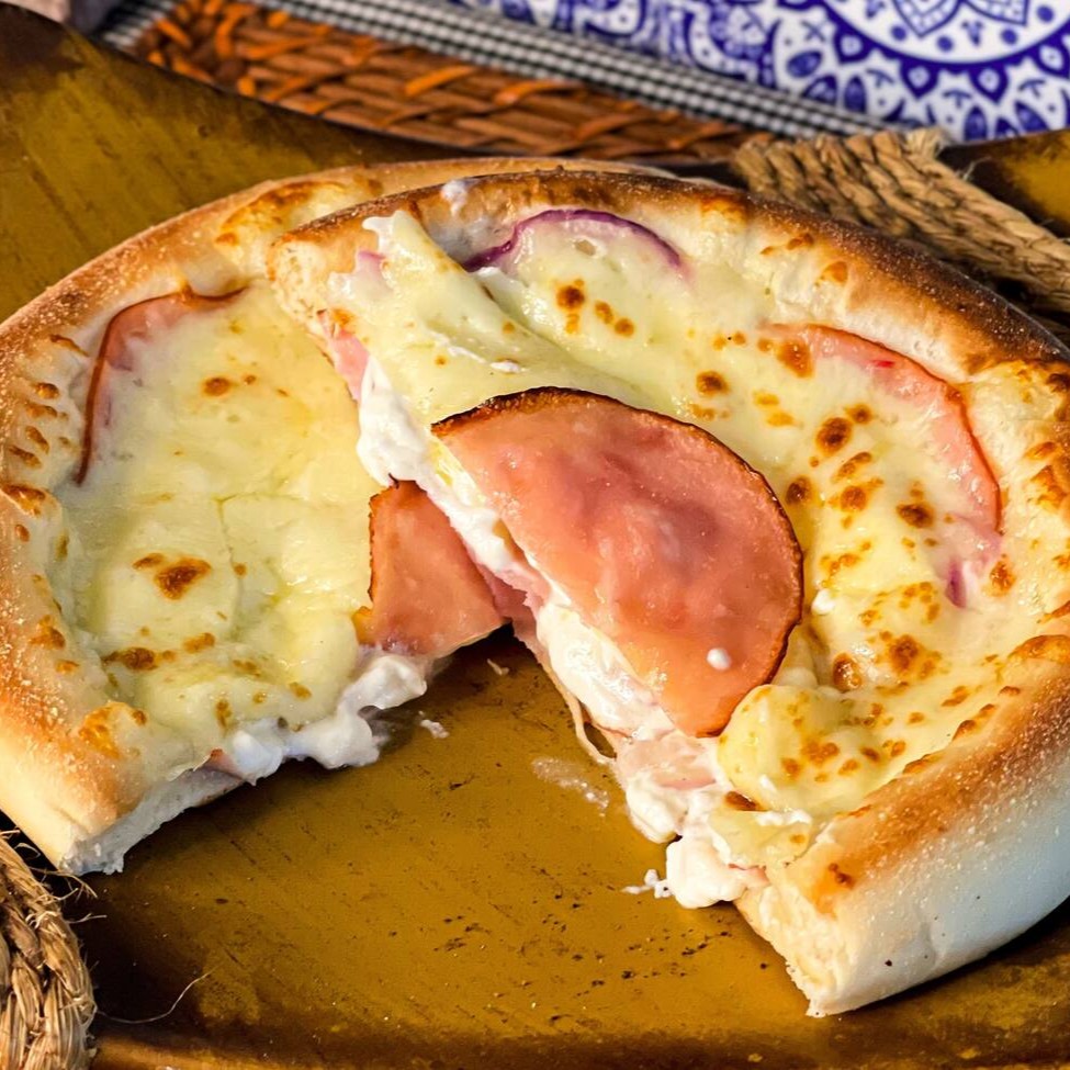 Mussarela por cima, presunto, ovo, calabresa, bacon, ervilha e cebola por baixo.