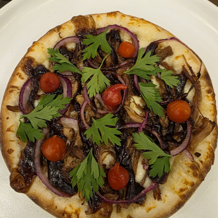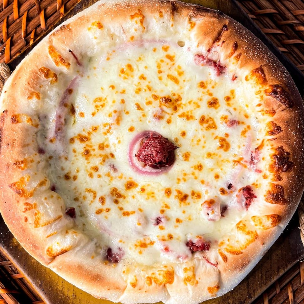 Queijo mussarela, costela bovina desfiada, cebola roxa, pimenta biquinho e salsa (cebola opcional pedir na descrição)