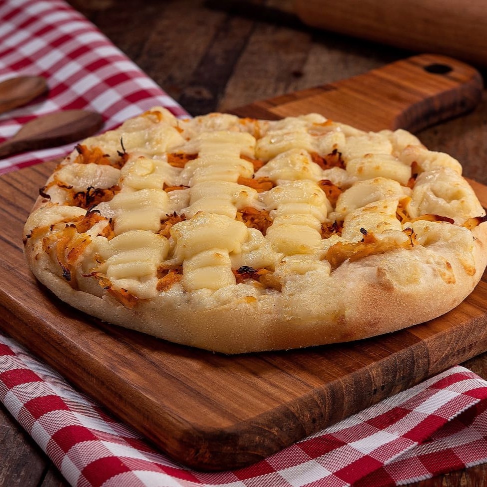 Mussarela, frango desfiado temperadinho e requeijão premium