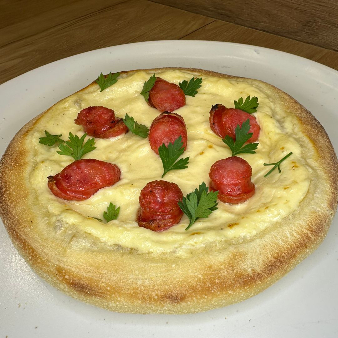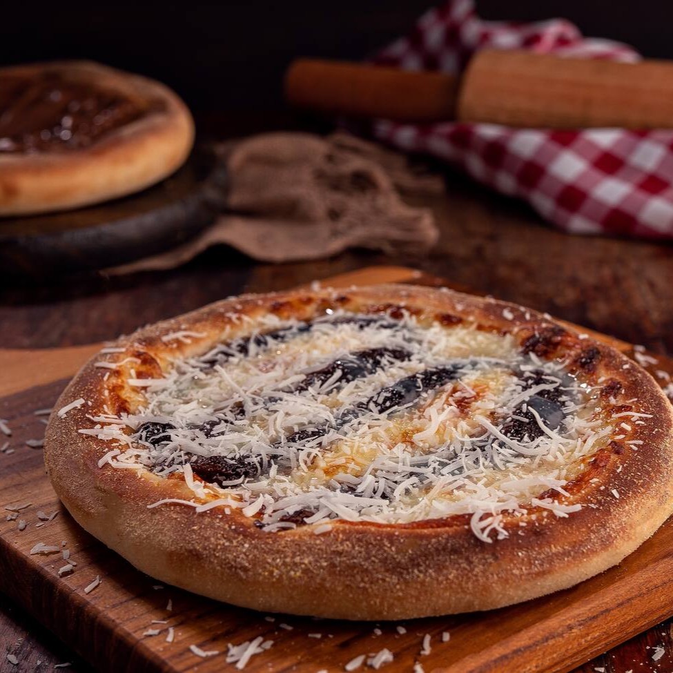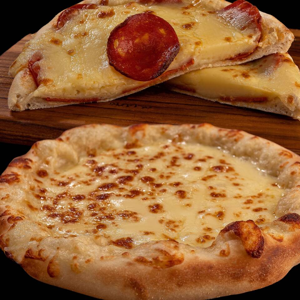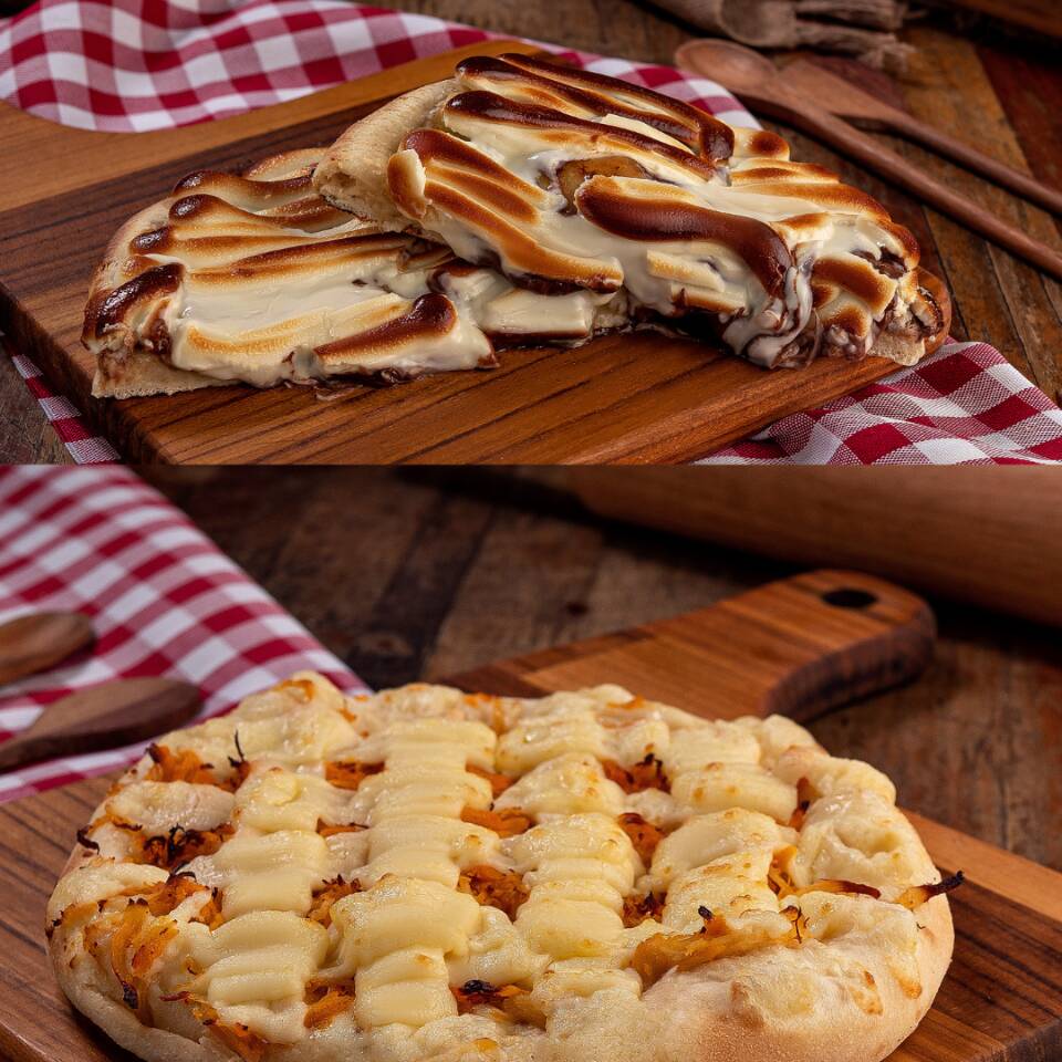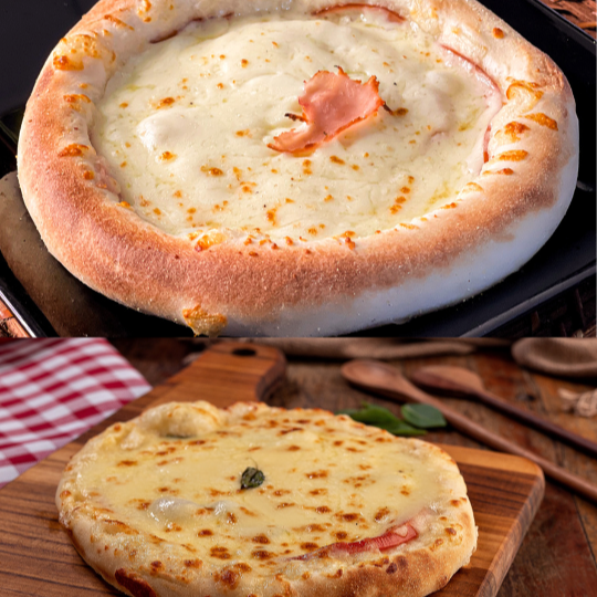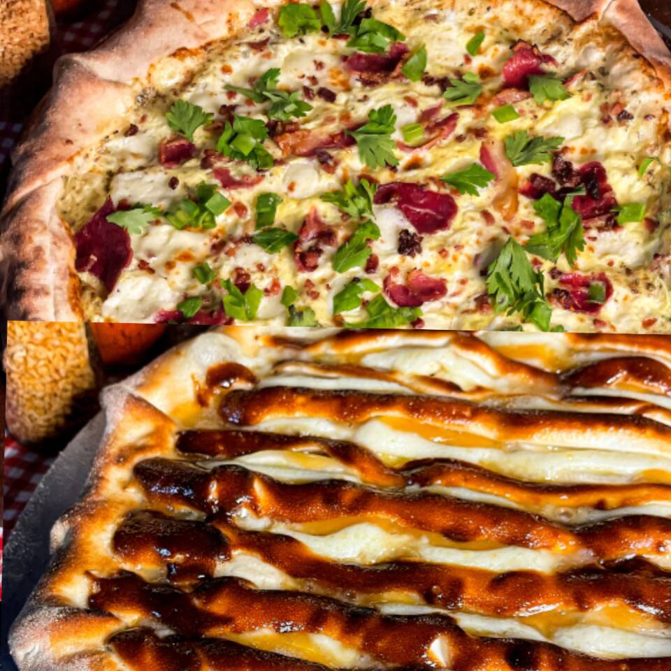 Magnífica pizza com queijo muçarela, molho de tomate da casa, bacon em fatias, ovos no forno, requeijão premium e salsinha. + Pizza maravilhosa de banana, doce de leite, chocolate branco e requeijão premium.