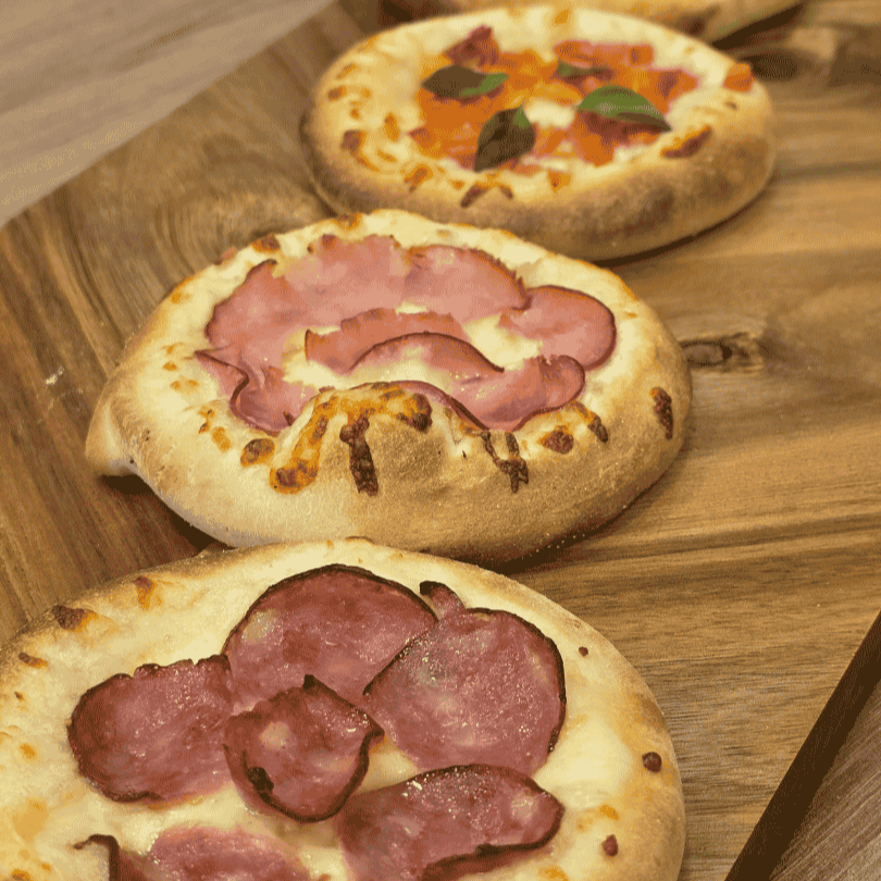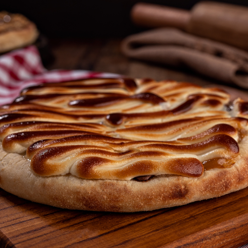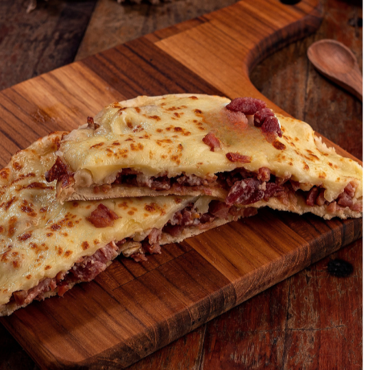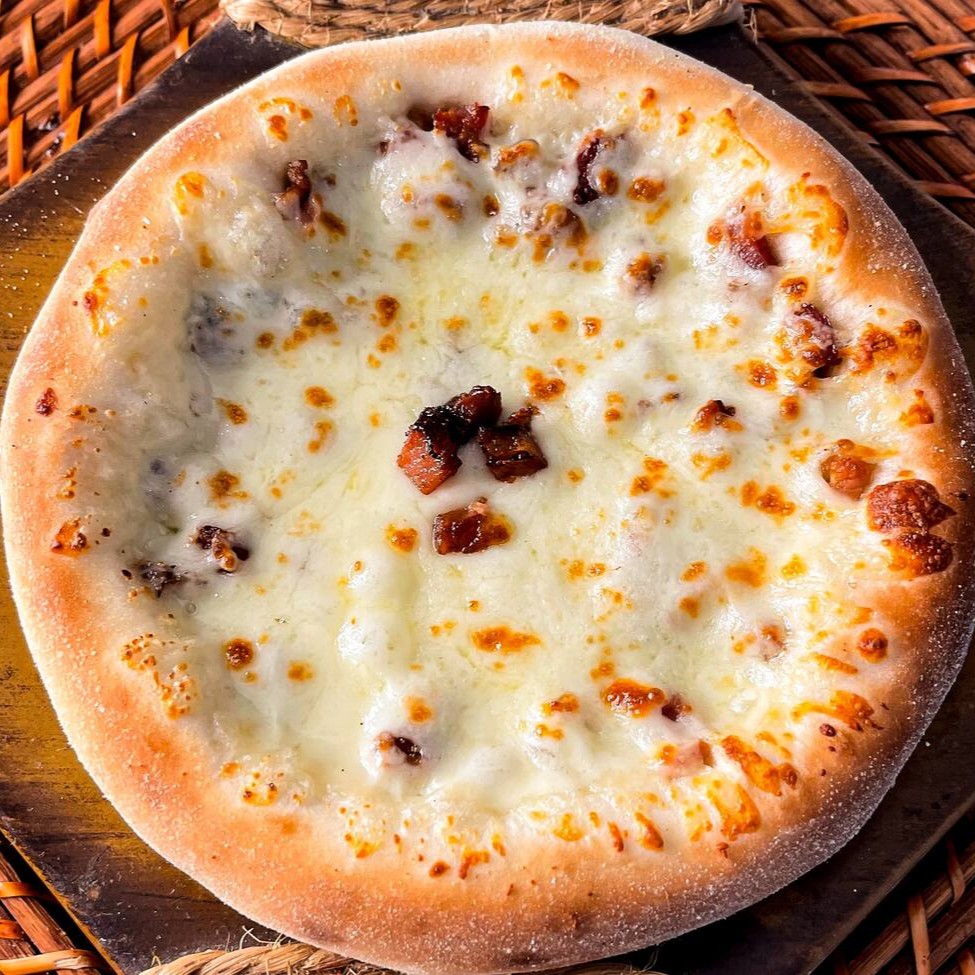 Mussarela por cima e bacon em cubos super crocantes.