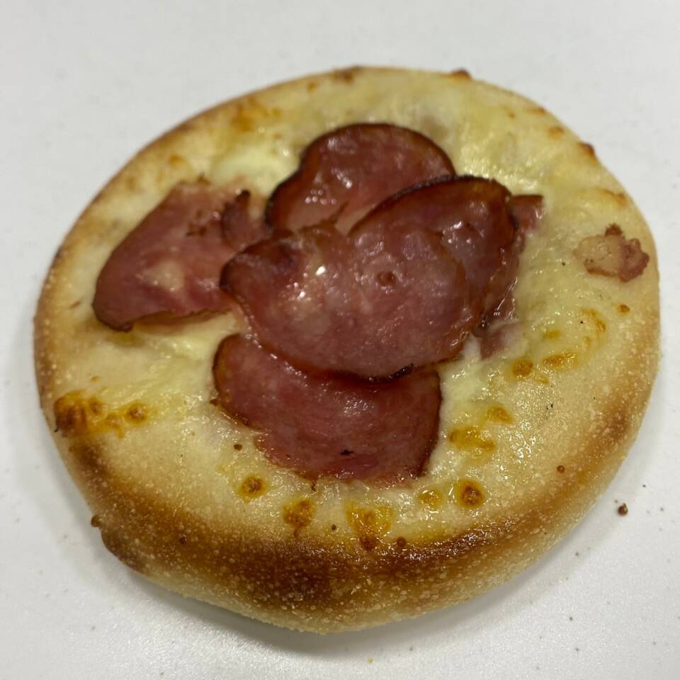 Mussarela por cima e lombo canadense por baixo.