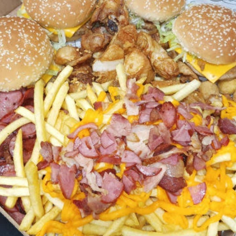2 xtudo( pão,carne ,queijo,presunto,bacon e calabresa ) acompanhado de batata frita com cheddar, bacon, calabresa