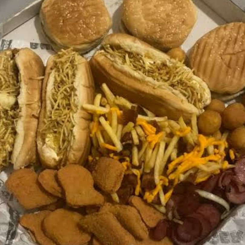 6 xtudo com batata frita cheddar, bacon , calabresa , 2 nuggets ou 2anéis de cebola