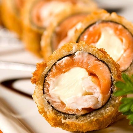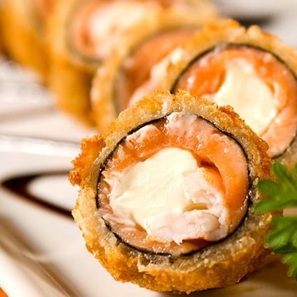 Salmão,Arroz,Cream cheese,Empanado com farinha Panko e Frito