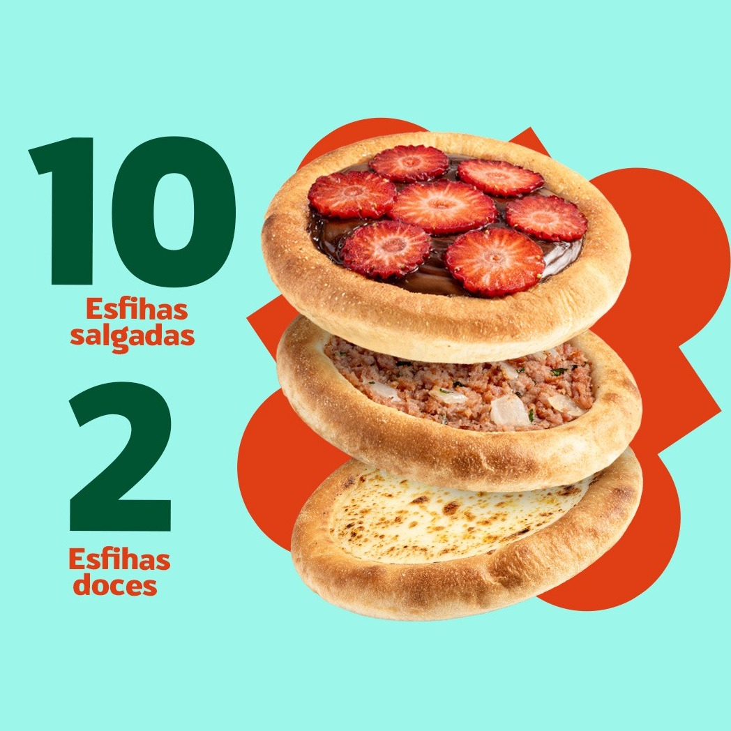 Salgada + Doce, é Tudo de Bom: Compre 10 esfihas salgadas e ganhe 2 esfihas doces de presente! Uma explosão de sabores salgados e doces para você saborear sem parar.