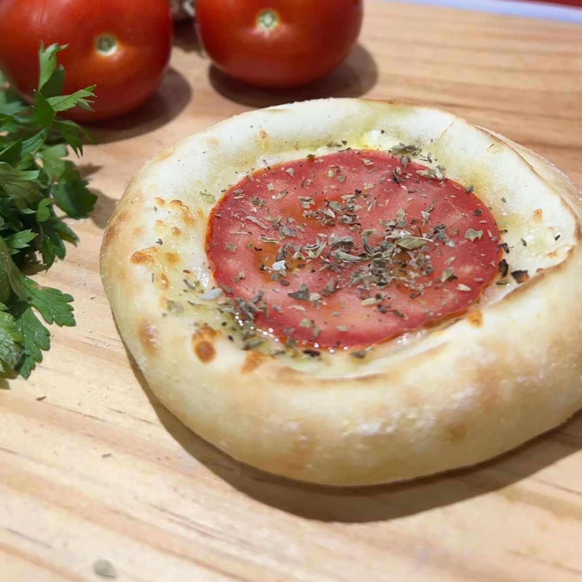 Muçarela, rodelas de tomate fresco, orégano. Leve e aromática!
