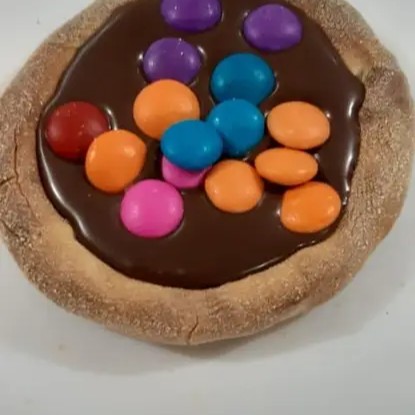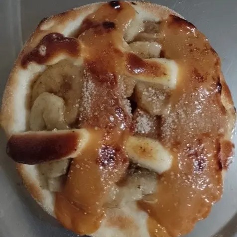 Banana, chocolate branco, doce de leite e açúcar com canela.