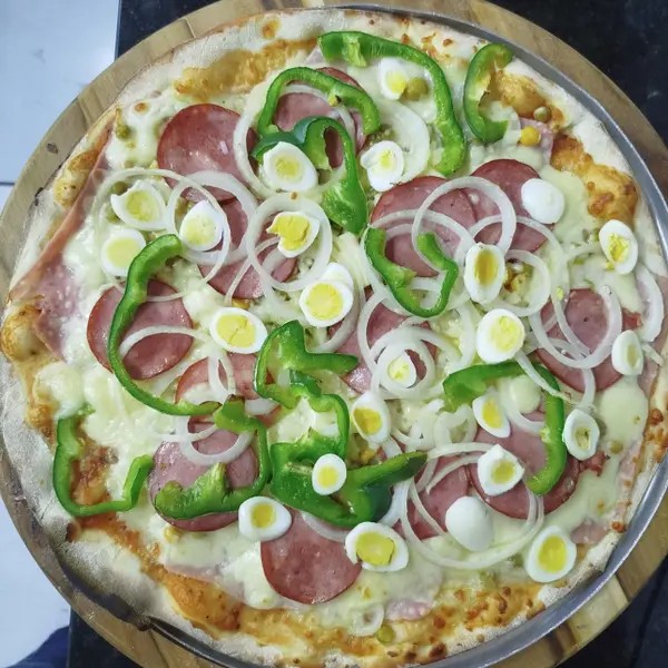 molho, presunto, milho, ervilha, mussarela, ovo, calabresa, pimentão, tomate, cebola e azeitona.
