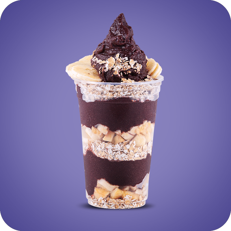 Escolha açaí natural, morango, banana... escolha mais 3 complementos: granola, leite em pó, amendoim picado, jujuba, farofa de amendoim, granulado, escolha uma cobertura, chocolate, morango, caramelo