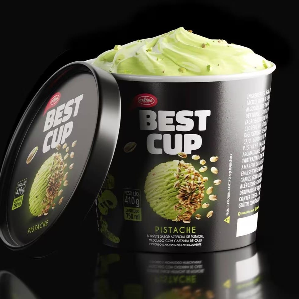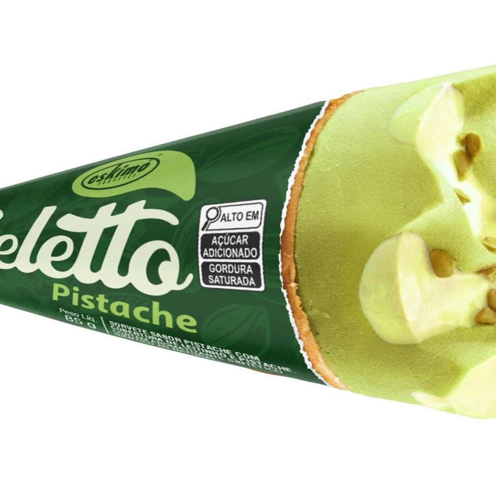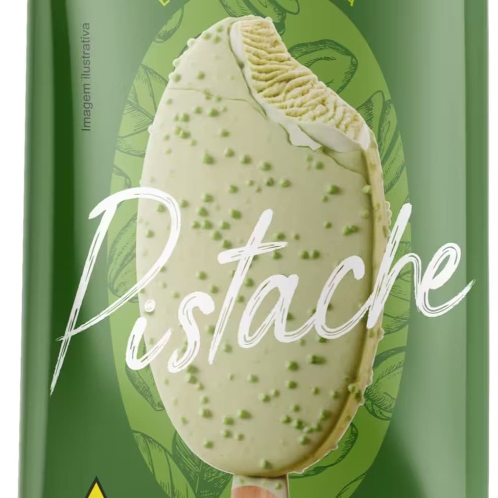 Delicioso sorvete no sabor pistache, com cobertura leitinho e pistache.