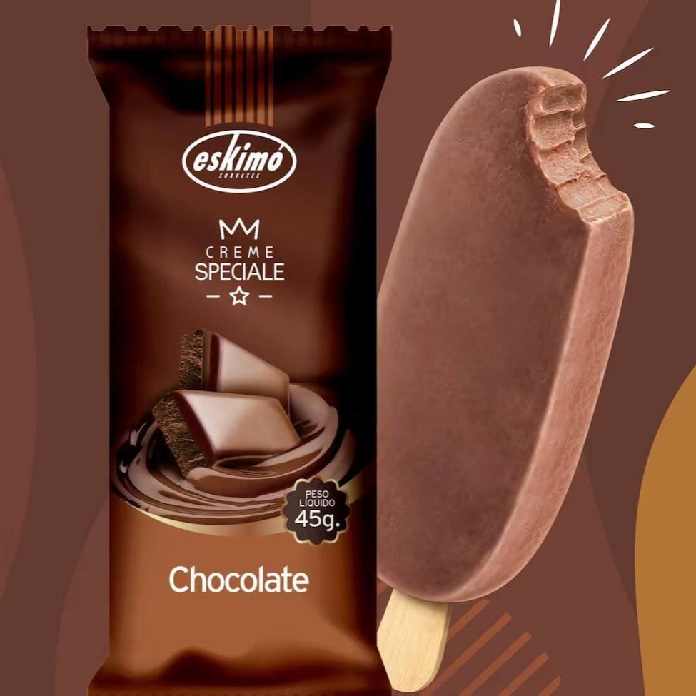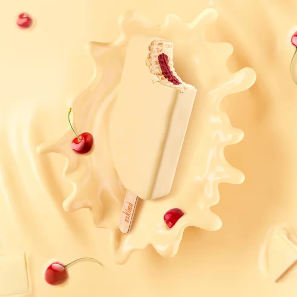 Delicioso Picolé 4 Leites recheado com amarena e casquinha de chocolate branco