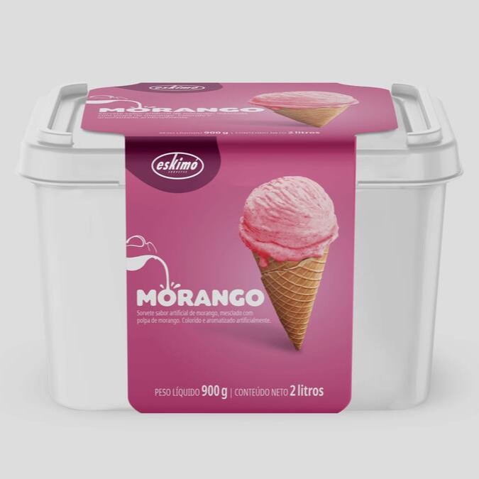 Sorvete sabor morango, mesclado com cobertura de morango. Colorido e aromatizado artificialmente.