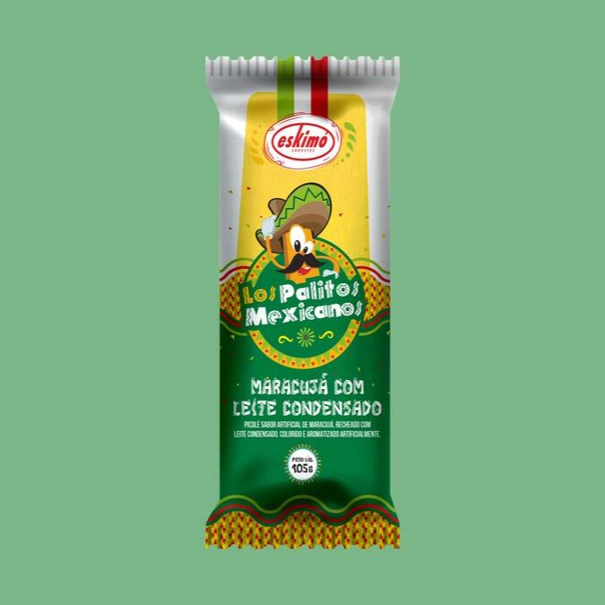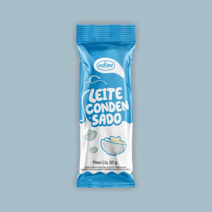 Picolé sabor artificial de leite condensado, colorido e aromatizado artificialmente.