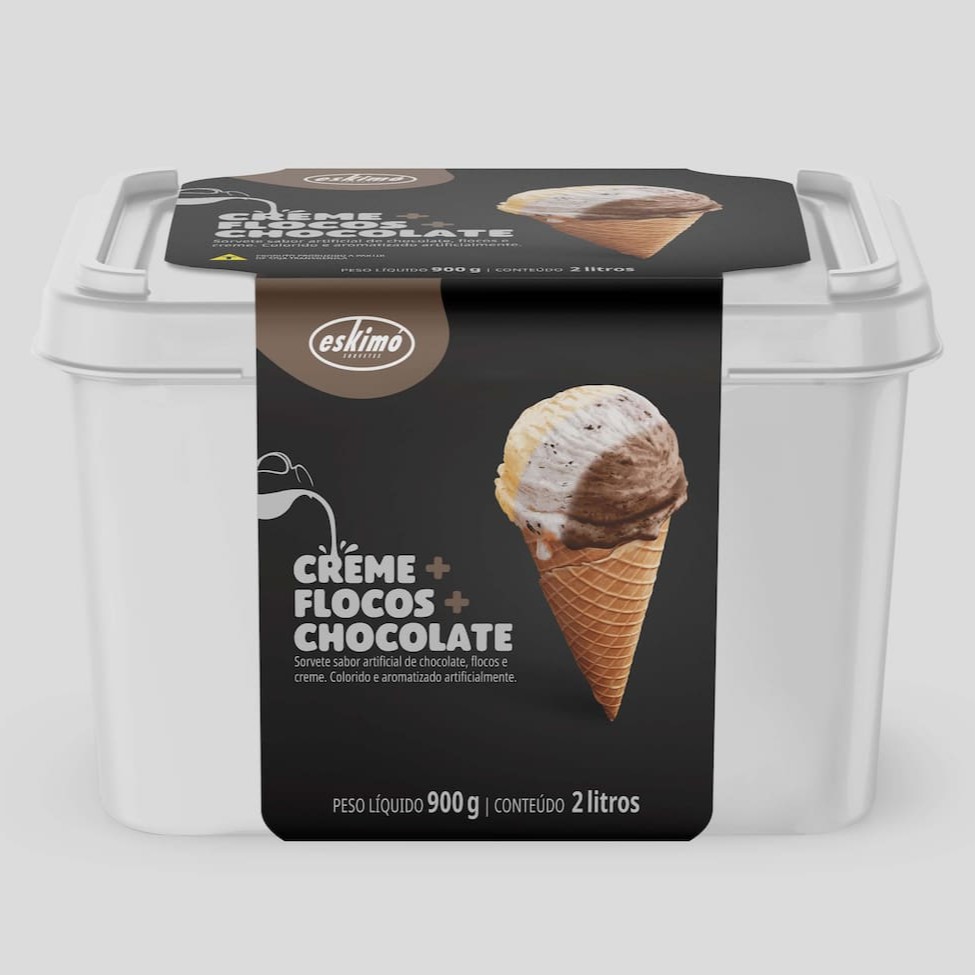 Sorvete sabor artificial Chocolate, Flocos e Creme. Colorido e aromatizado artificialmente.