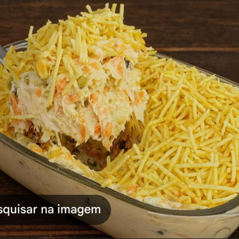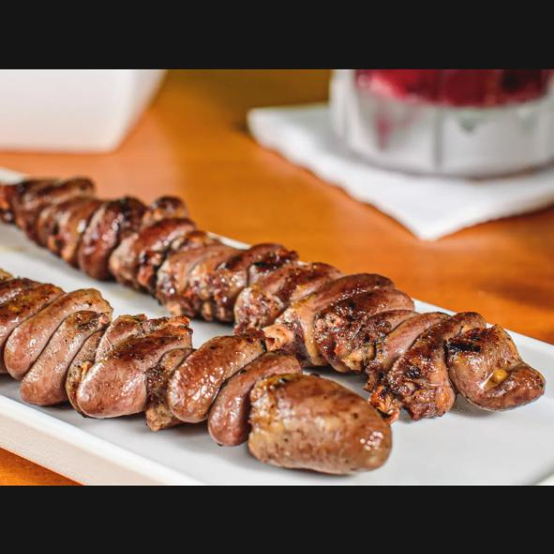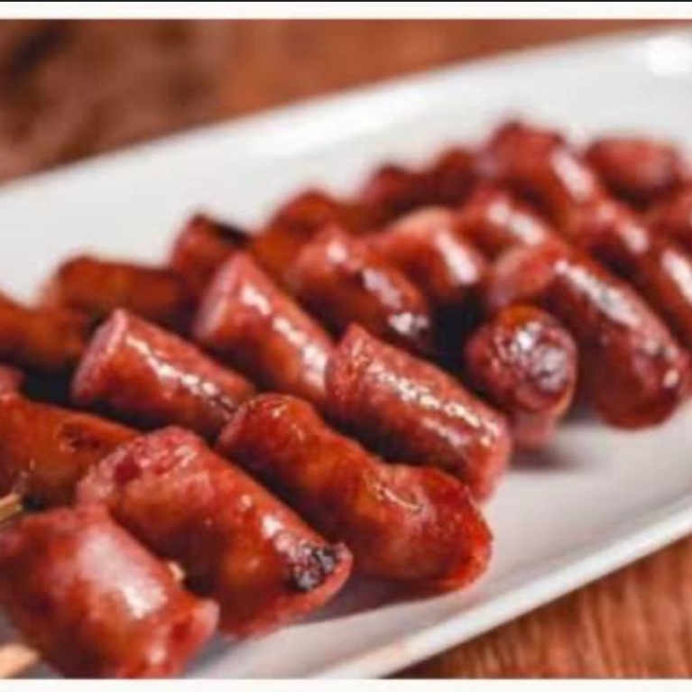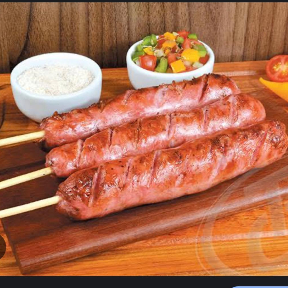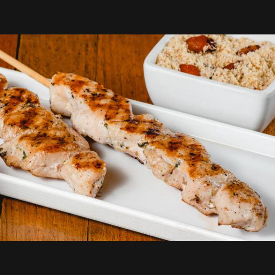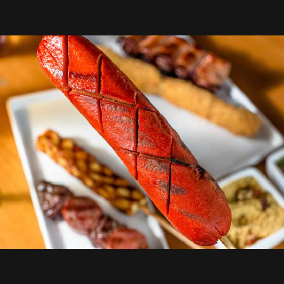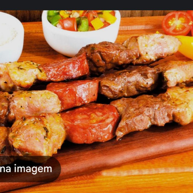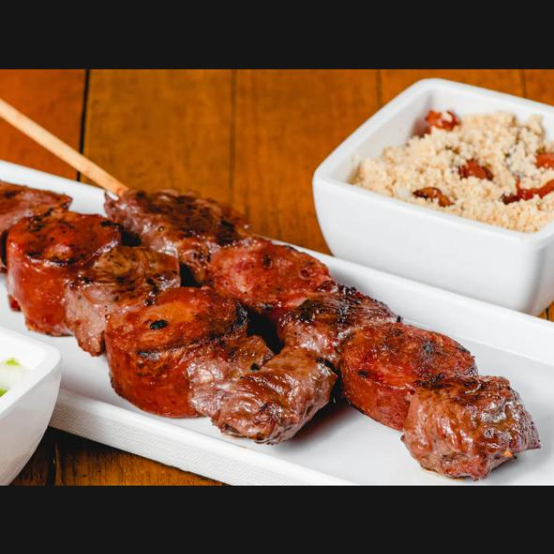Arroz farofa Macarronese molho 5 espetos carne mista linguiça queijo filé pão e batata frita