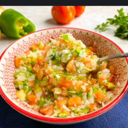 Arroz farofa salpicão molho e um espeto misto carne frango e linguiça.