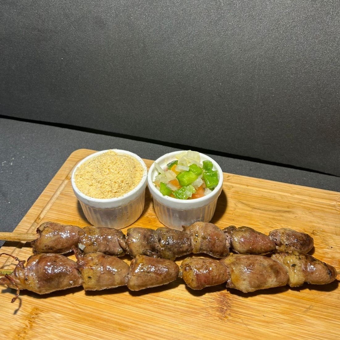 Espeto de Coração Corações de frango selecionados, bem temperados e assados na brasa até ficarem douradinhos por fora e macios por dentro. Um clássico irresistível do churrasco, cheio de sabor e com aquele toque especial da grelha!