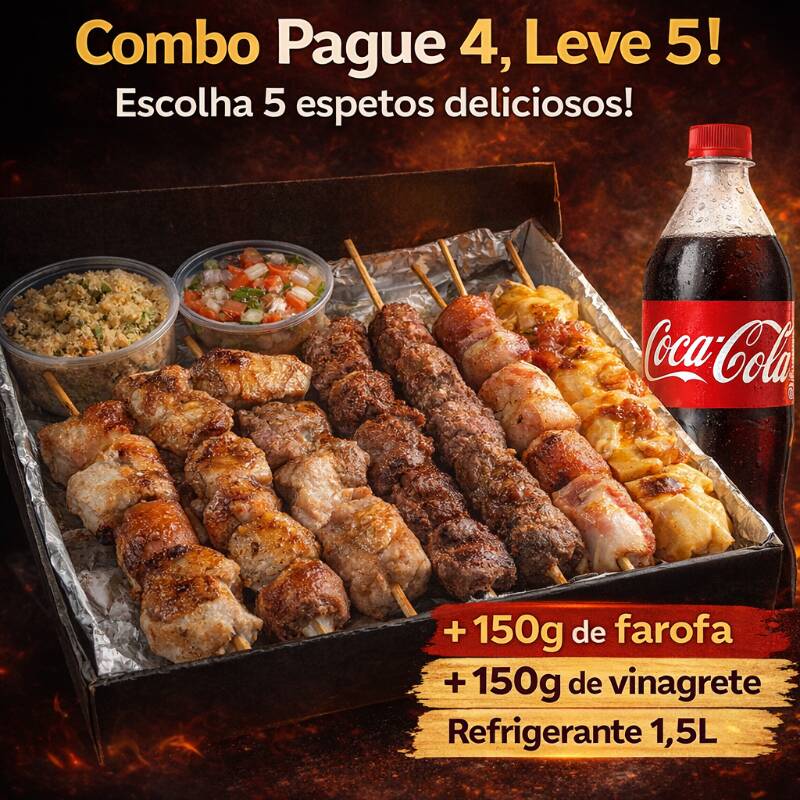 Combo Pague 4, Leve 5! Escolha 5 espetos deliciosos, acompanhe 150g de farofa, 150g de vinagrete e um refrigerante 1,5