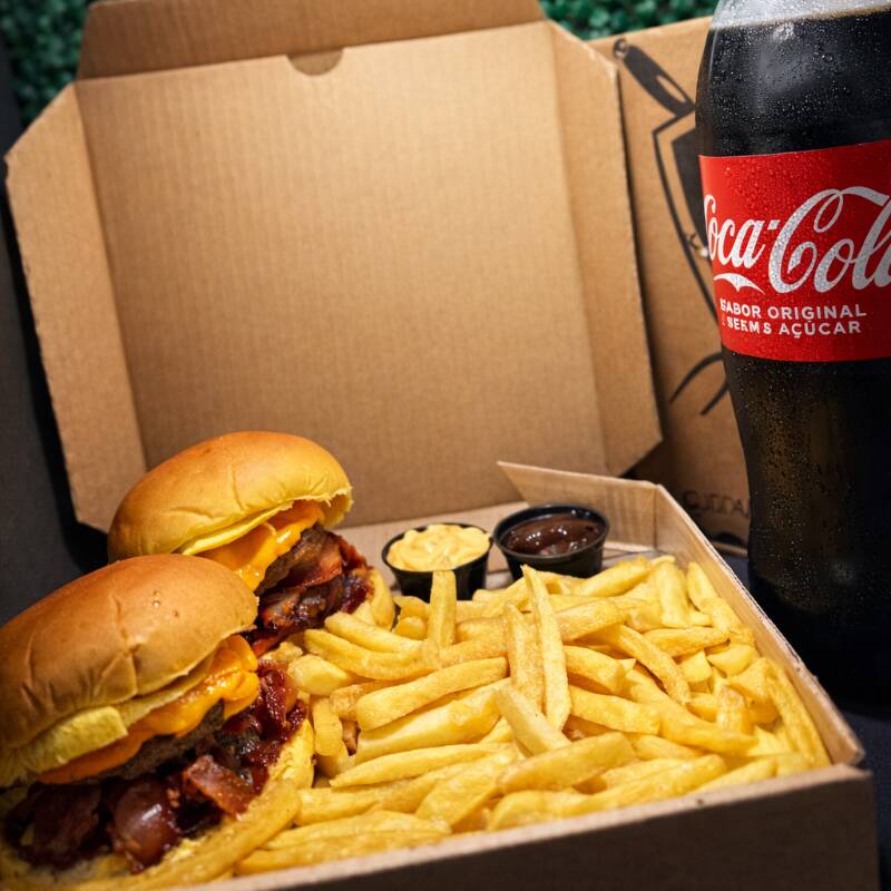 2 hambúrgueres duplos, feitos na churrasqueira, com 2 carnes de 60g cada por hambúrguer, cheddar derretido, bacon crocante e molho barbecue especial 😋🔥 Acompanha: 🍟 500g de batata frita 🥤 Refrigerante 1,5L