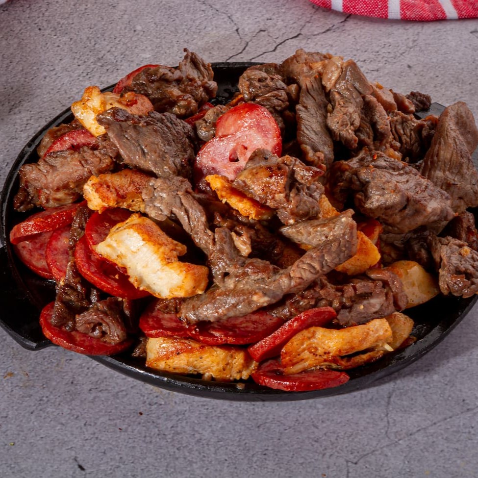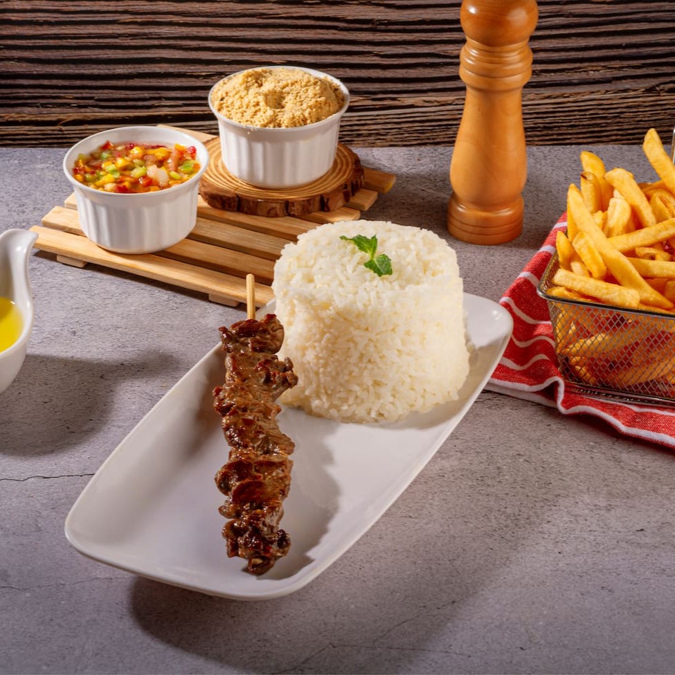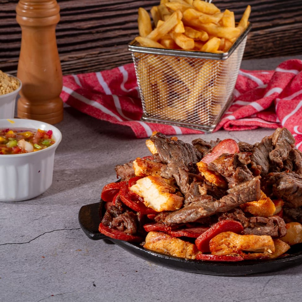 Churrasco Misto Com Arroz, Molho Vinagrete, Batata Frita E Farofa